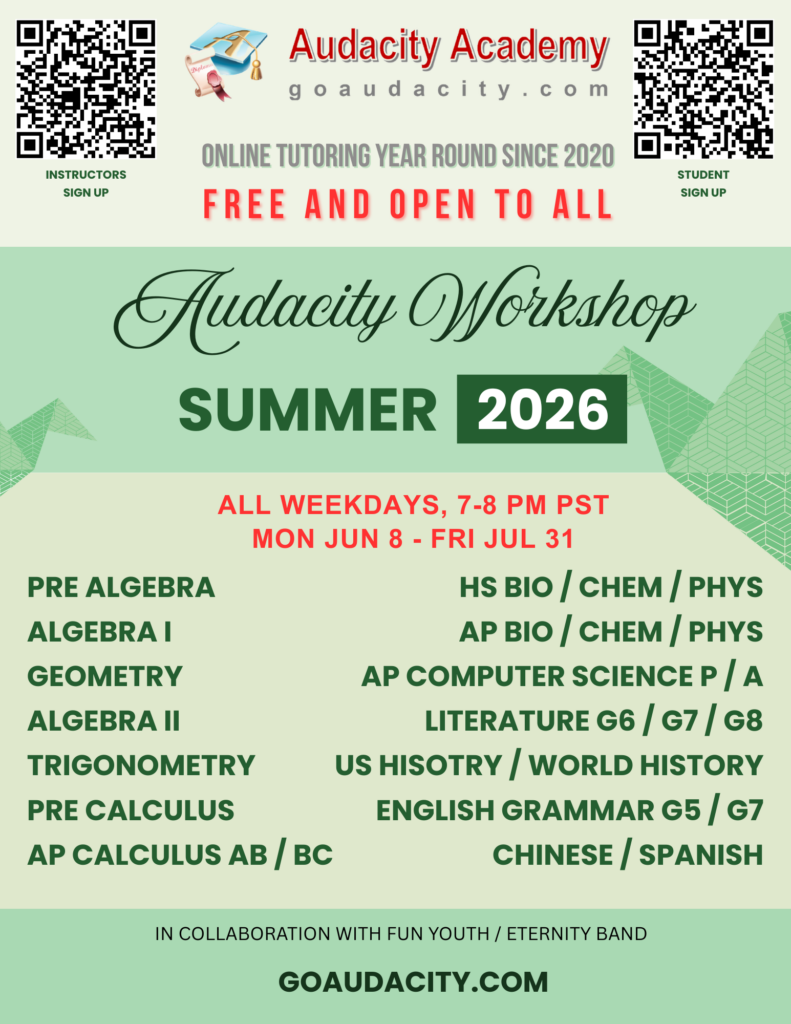 * Offering to expand year on year. The Audacity Academy is a long term venture. We will expand to additional grade levels and add additional courses such as Programing, World History, Debate, Art, and Music in the near future. * If there are subjects that students wish us to add, please let us know on the student sign up form ( Link on FAQ page ). We will consider add subjects if there is enough demand.